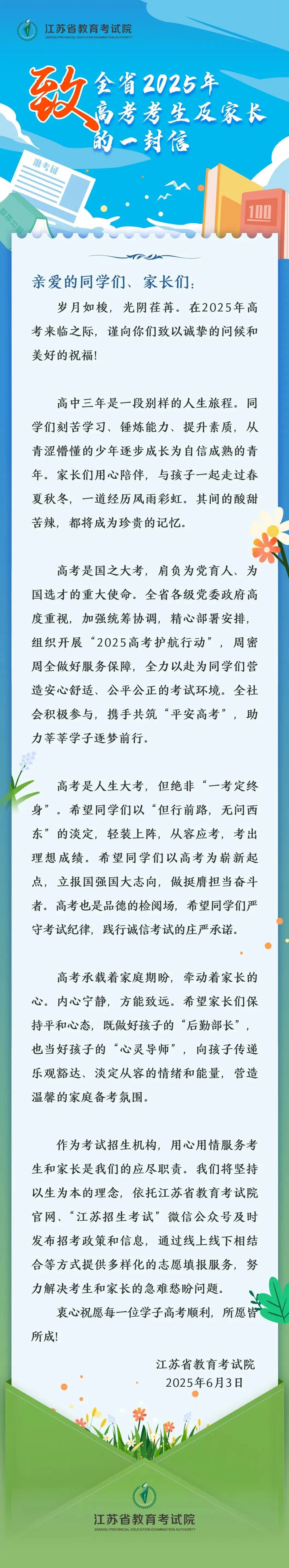 3.关注身心健康。考生及同住人员要做好自身健康第一责任人。加强卫生防护,考前尽量不前往人群聚集等场所。关注天气变化,及时增减衣物。监测身体健康状况,如有不适,及时就医治疗,并将相关情况报告考点或所在中学,避免影响考试。合理规划学习生活,注意饮食作息,做到劳逸结合。根据考试日程安排,合理把握备考节奏,调适好心理状态,以平稳平和心态从容应考。考试期间,当地气温达到30℃及以上,各考区可统一调度考点开启空调(外语听力考试期间不开启空调),空调设定制冷温度不低于26℃,考生可携带必要衣物,谨防身体不适。