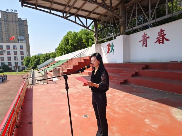 教务处副主任吴秀琴做题为《守护青春灯塔,共筑法治晴空》的国旗下讲话,她紧密结合学生们的日常生活实际,从网络安全、交通安全、校园欺凌等多个维度,用通俗易懂的语言和亲切的口吻,引导学生们树立法治意识。