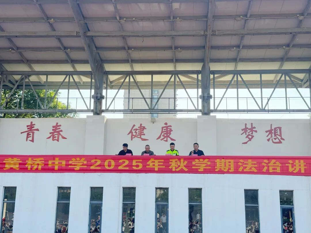遵守规则以律己,怀敬畏而前行。江苏省黄桥中学始终秉持“立德树人”的教育理念,将法治教育作为助力学生成长成才的重要基石。9月15日下午,我校全体学生在班主任的组织带领下齐聚操场,共同聆听了一场关于法律知识与安全防护的“智慧盛宴”。黄桥交警中队队长李凯、黄桥司法所所长秦岳、黄桥司法所曹晓宇主任,以及我校德育中心韩健主任出席本次活动。