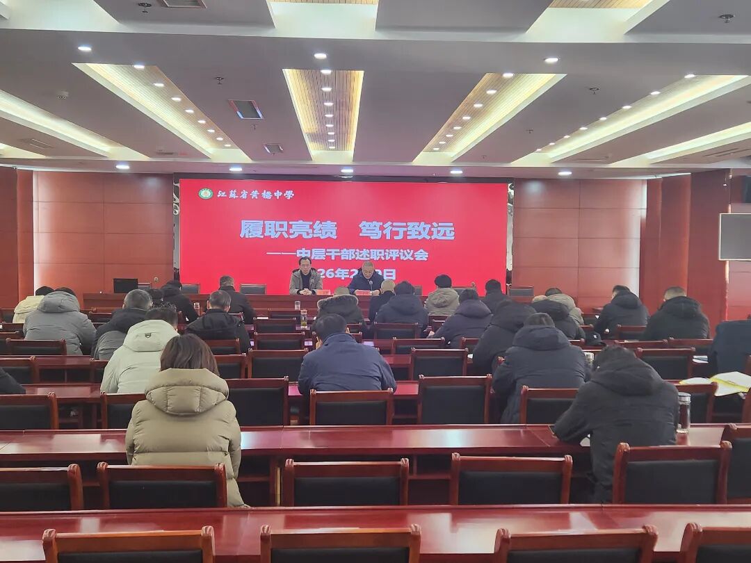 2月9日上午,江苏省黄桥中学召开2025年度中层干部述职评议会,学校党委书记吴卫东、校长马荣辉等领导班子成员及全体教代会成员参会。各年级部、职能部门中层干部依次登台述职,亮实绩、找差距、谋新篇,并接受民主评议。