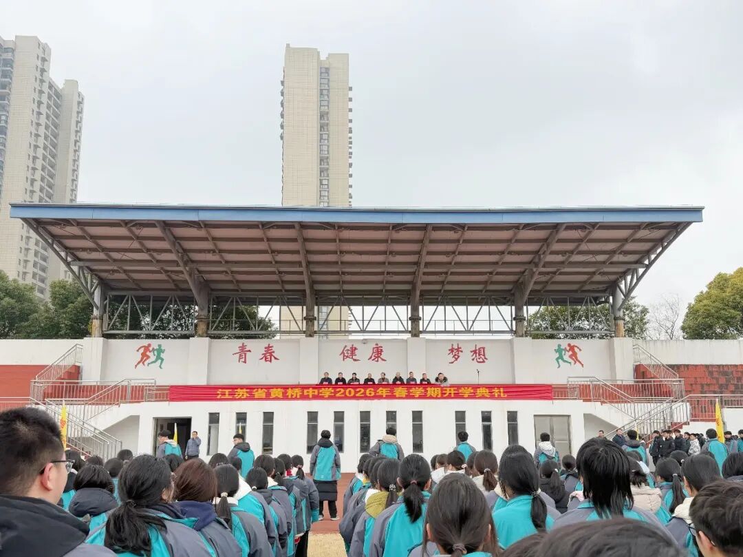 春风拂面,万物竞发。3月6日上午,江苏省黄桥中学全体师生齐聚校园,隆重举行2026年春学期开学典礼,共同开启新学期的美好篇章。学校党委书记吴卫东,校长马荣辉,副校长丁勇俊、徐国相、燕亚新、蒋国庆,党委委员、高二年级部主任吴琼,高一年级部主任徐兵、高三年级部主任陆飞军出席典礼。活动由丁勇俊副校长主持。